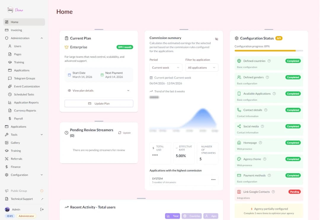 Connect your Telegram groups to manage community, support, and announcements in a single operational thread. Multilingual support via Telegram translates on the fly: it doesn't matter if you speak English and your streamer speaks Arabic, the conversations will always be in the language that everyone can understand, your agency can grow beyond any border without language limitations.